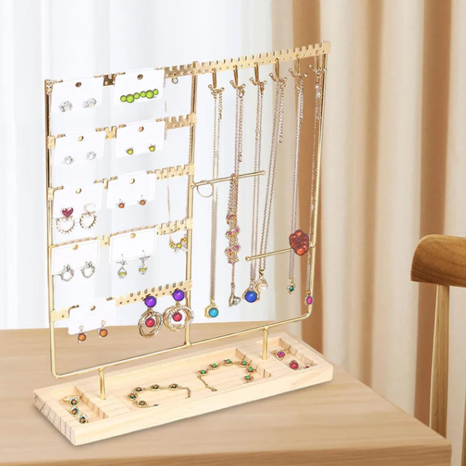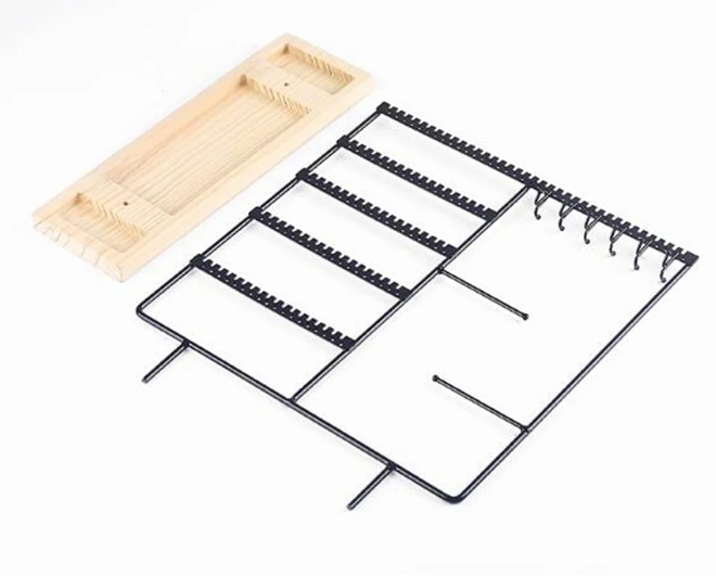 Keep your jewelry beautifully organized and on display with this 5-tier earring holder stand. Featuring 90 earring holes and 2 built-in metal bars, it’s perfect for neatly arranging studs, hoops, bracelets, and other accessories. The durable metal rack combined with a solid wooden base adds a modern yet rustic charm to your vanity, dresser, or shop counter. Simple to assemble, stylish, and space-saving—this jewelry organizer is a must-have for collectors and creators alike.