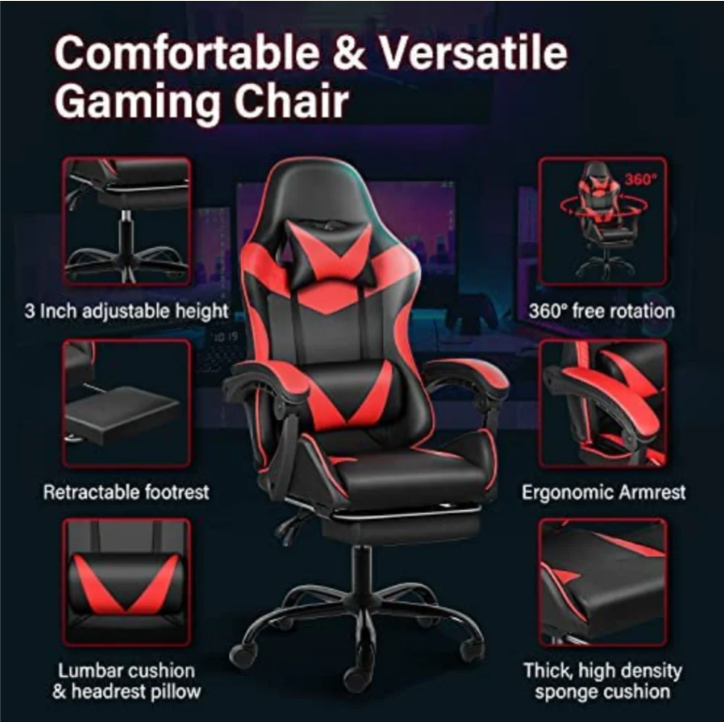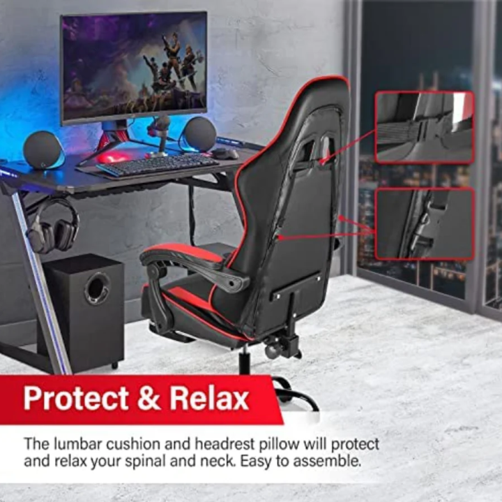 - Ergonomic Design: Equipped with massage lumbar and headrest cushions to alleviate neck fatigue and reduce pressure and pain in the lower back, enhancing your overall comfort during long sessions.