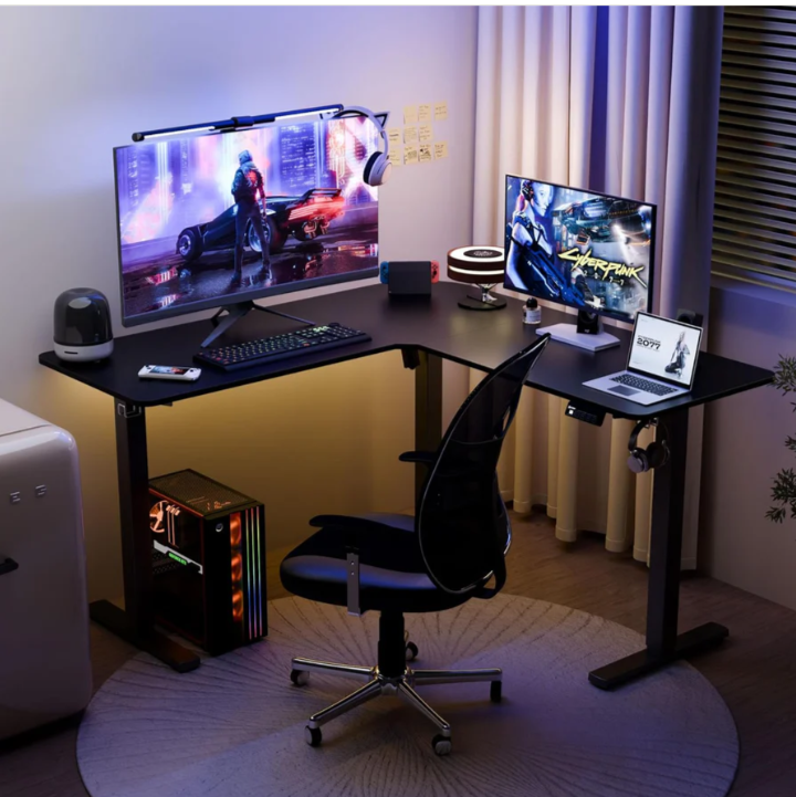 - L-Shaped Design: Optimizes corner space while providing a large working area of 129 x 50 cm, accommodating 2 to 3 computer monitors. The 90° design enhances room efficiency and modern aesthetics.