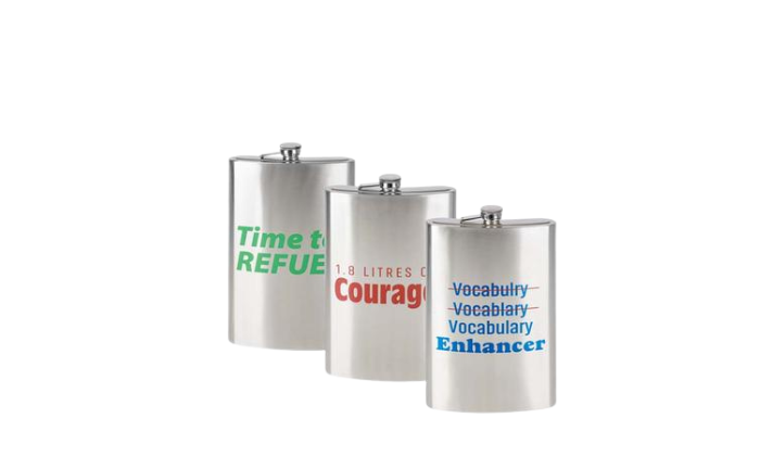 27cm stainless steel hip flask with words design, large 1.8L capacity for parties or display.