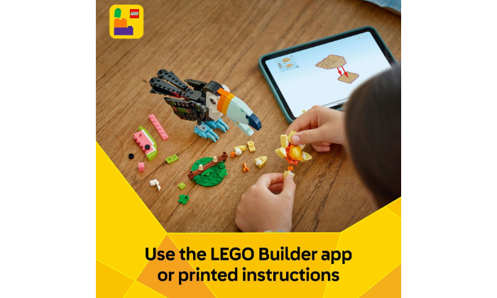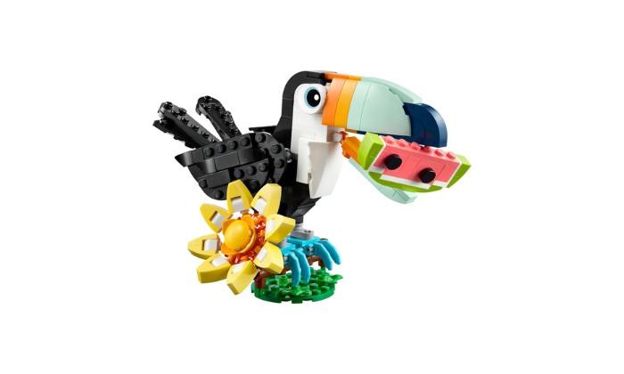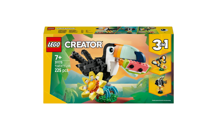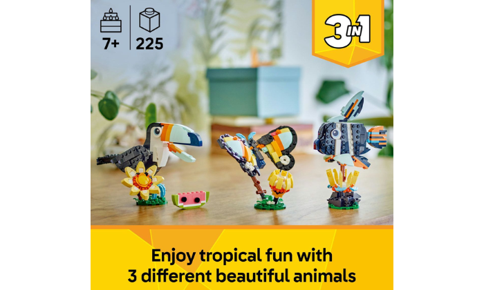 Bring the tropics to life with the LEGO Creator 3in1 Tropical Toucan set (31173)! With 225 pieces, kids aged 7+ can build, play, and display 3 colourful animal figures – a posable toucan with a watermelon slice, a butterfly with movable wings, or a tropical fish with rotating fins.