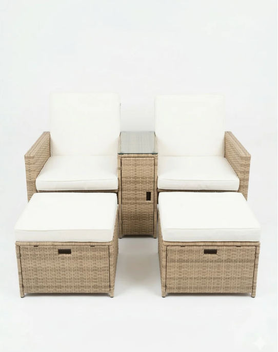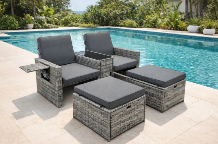 - It has two ottomans and a coffee table, the coffee table can be opened and store magazines, cushion and other small stuff. There is a shelving board on the right side of the lounge chair, more space for magazines or drinks and so on.