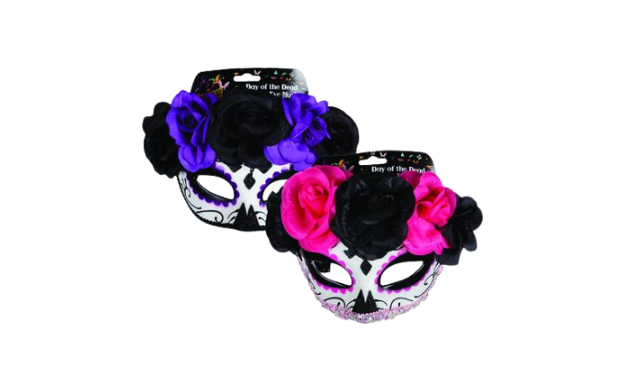 A vibrant Day of the Dead mask decorated with flowers, perfect for festive celebrations or Halloween.