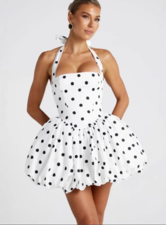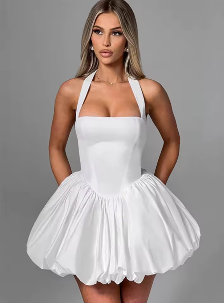 Turn heads in this bold and sophisticated backless mini dress. Designed with a flattering A-line silhouette, voluminous pleated hem, and sleek halter neckline, it’s the perfect choice for special occasions, date nights, or elegant evenings out.