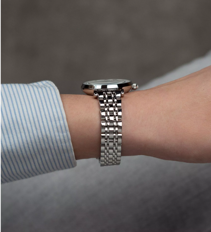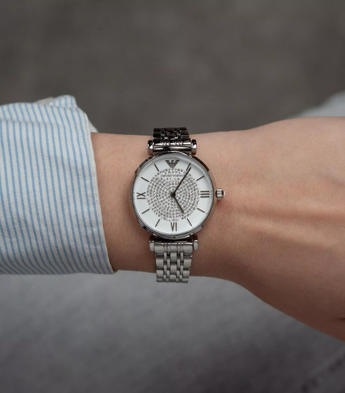 Elegant and timeless, the Emporio Armani Lady Pave Stones Watch features a stainless steel case and bracelet with a refined white dial accented by sparkling stone pavé. Powered by reliable quartz movement, it combines everyday durability with sophisticated style.
