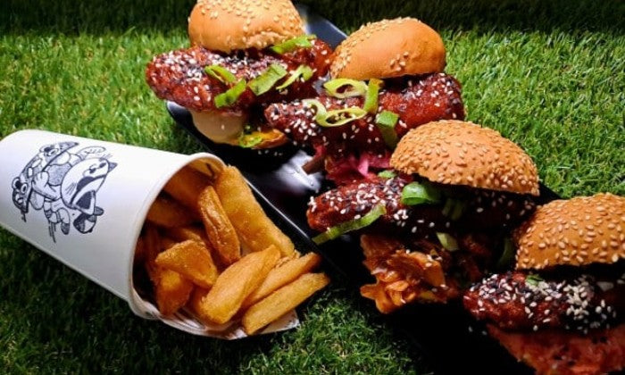 - 2 x Cos Lettuce, Smokey Tomato & Dill Cucumber Sliders: double fried crispy chicken, topped with umami Korean sauce, vegetable mayo, cos lettuce, smokey tomato and dill cucumber