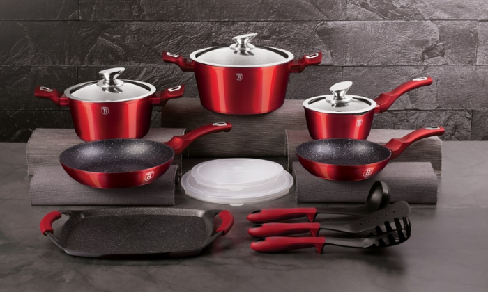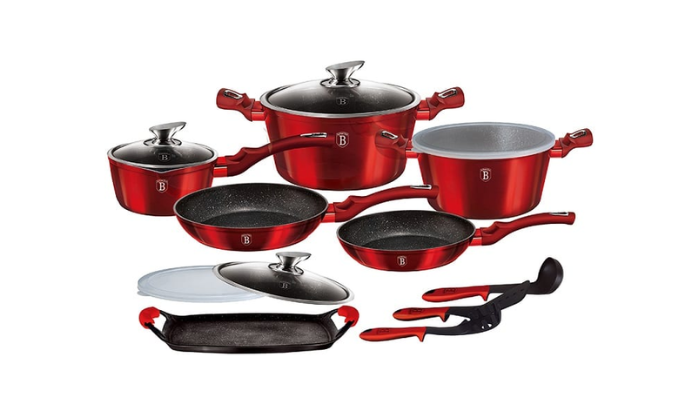 Upgrade your kitchen with the Berlinger Haus 16-Piece Cookware Set from the Metallic Burgundy Line – where elegance meets performance. Crafted from premium forged aluminium with a 3-layer non-stick marble coating, this set ensures effortless cooking and easy cleaning. Designed for style, durability, and efficiency, it works on all cooktops including induction and is completely free of PFOA, lead, and cadmium. With smart stackable design, turbo induction bases, and heat-resistant silicone handles, this set is perfect for everyday cooking and entertaining in style.