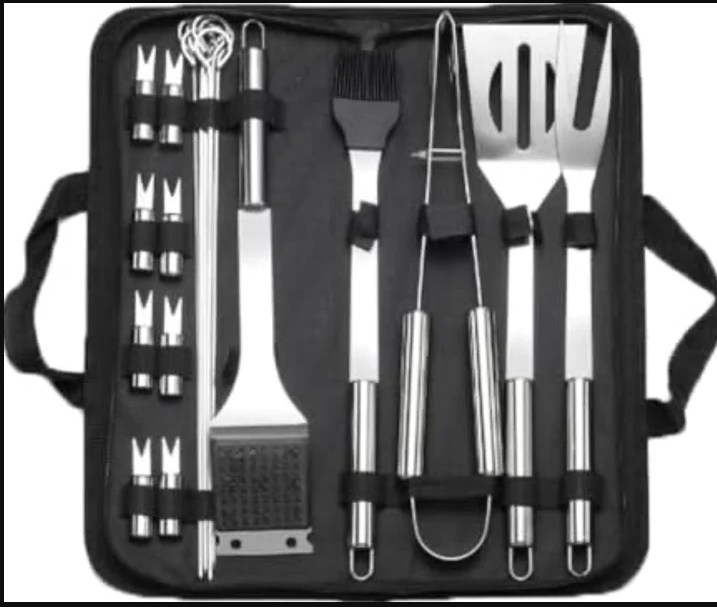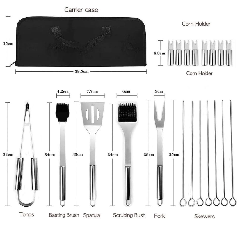 27-Piece Complete Set – Includes everything from tongs and spatula to skewers, corn holders, and even a grill mat.