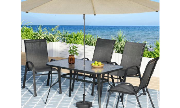 - 6-piece set → 4 chairs + table + umbrella