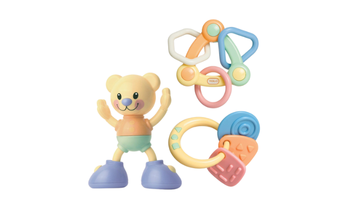 This Tolo baby toy gift set includes three engaging rattle and grab-and-play toys, each designed to support early sensory and motor development.