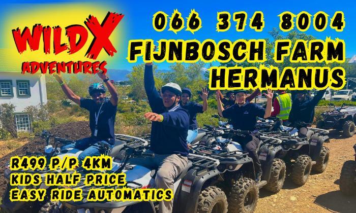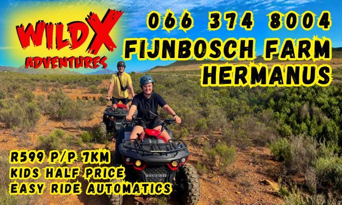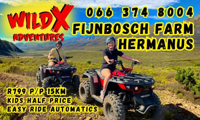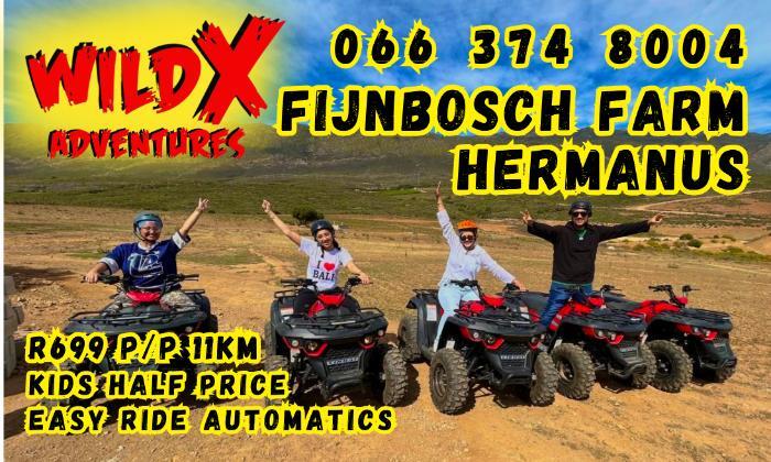 Looking for the perfect outdoor activity along the R43 between Hermanus and Stanford? Wild X Adventures at Fijnbosch Farm, Denvor Stud offers an exciting, safe, and scenic 4KM (20-minute) Quad Bike Ride designed with families in mind.