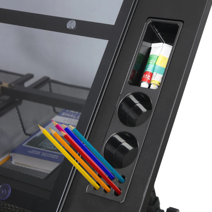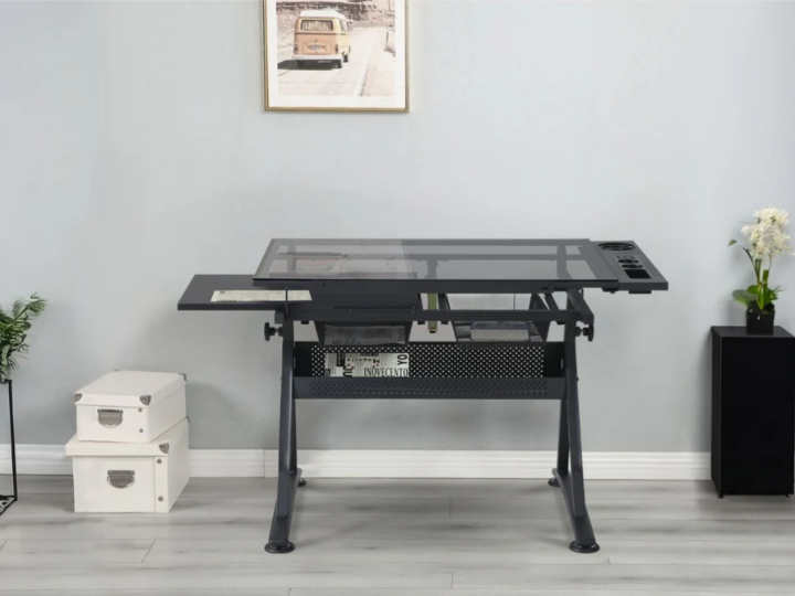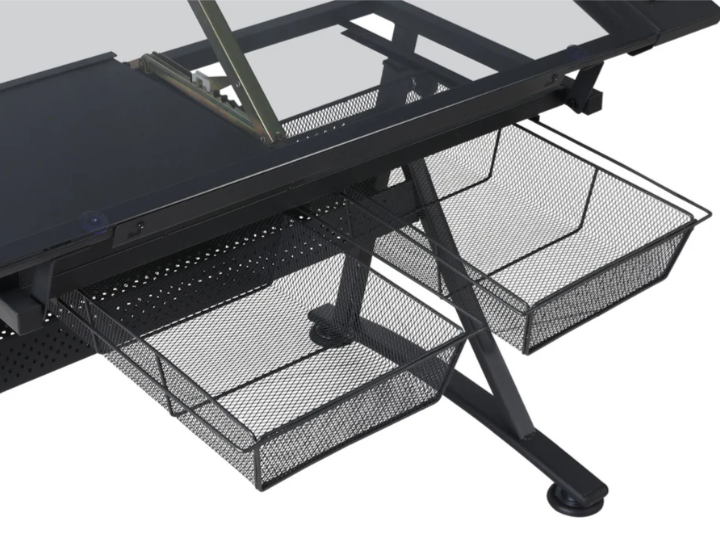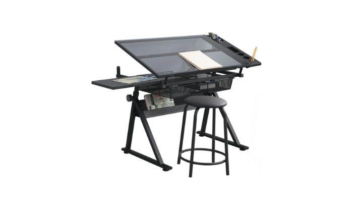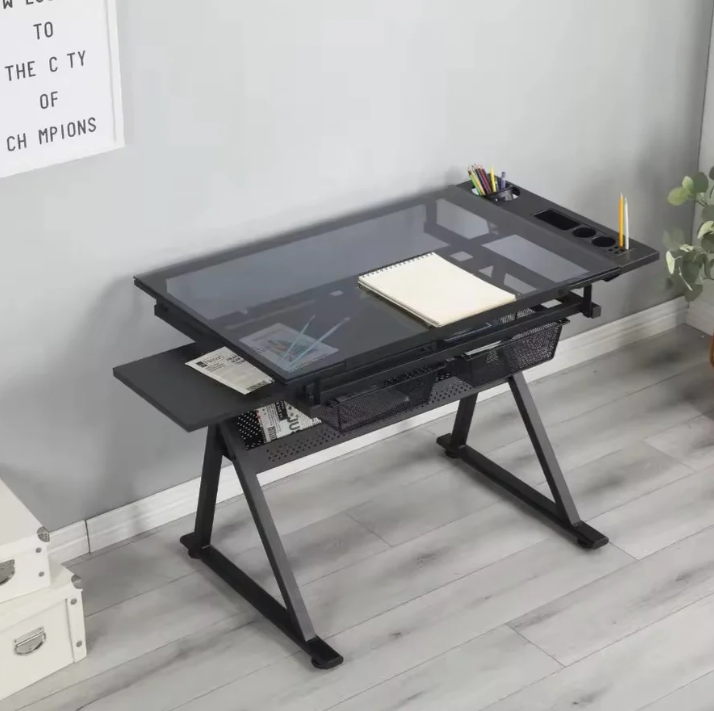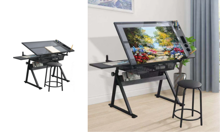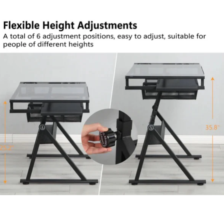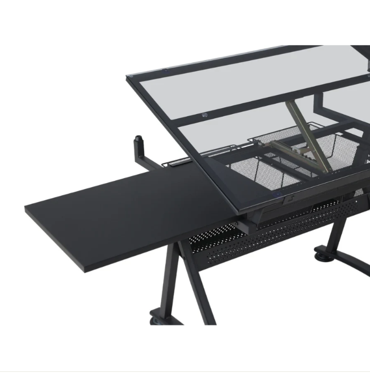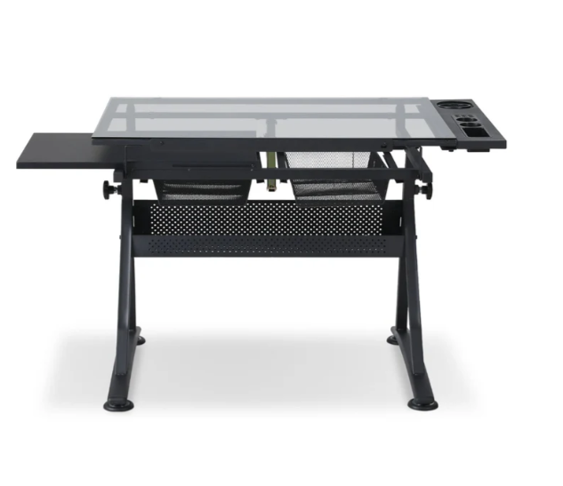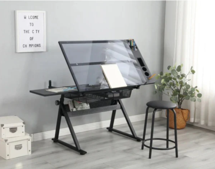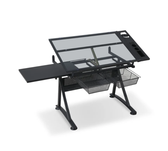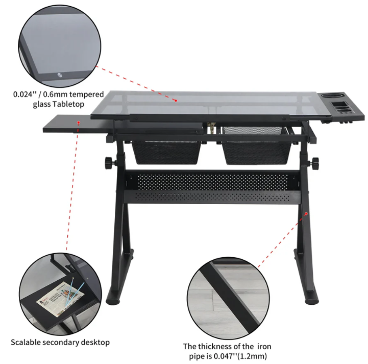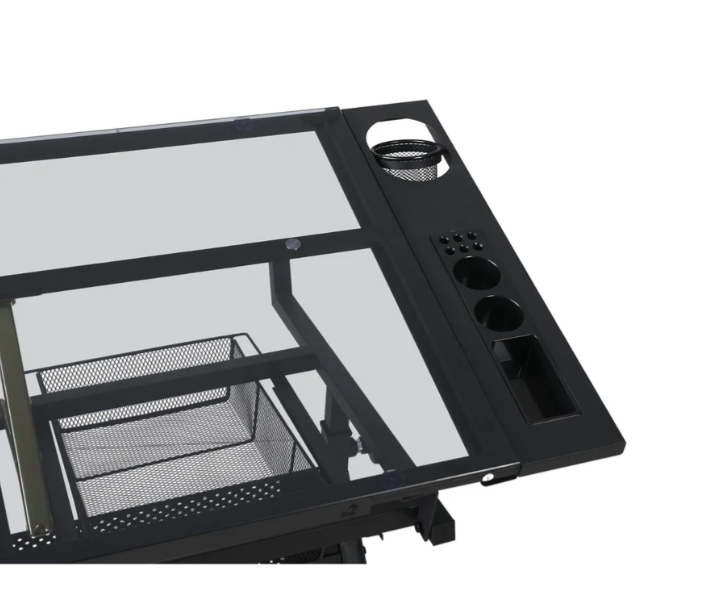 - Storage Space: The glass top drafting table includes multiple compartments, trays, and hanging drawers underneath for organizing paints, pens, and other equipment. The glass surface is easy to clean in case of spills