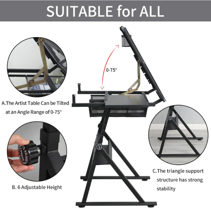 - This Table with Hand lifting,it can Height adjustment is 75cm-120cm,there are 2 metal drawers can meet various storage needs,The artist table can be tilted at an angle range of 0 to 75 degrees.The transparent glass countertop makes the piece a light table for drawing and sketching precise diagrams. Perfect piece for art, drafting, and creative tasks in the office, studio, or at home.This drawing table can be placed in the living room, study or room, very convenient to use.