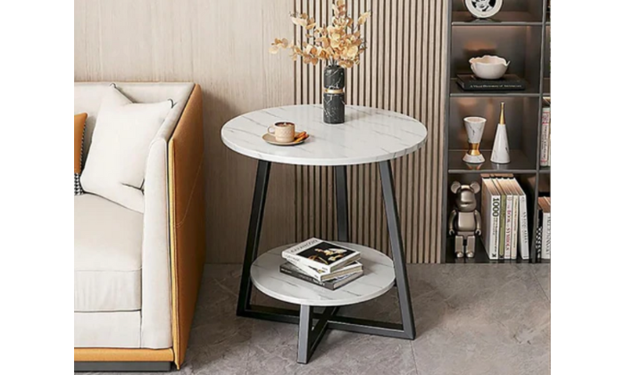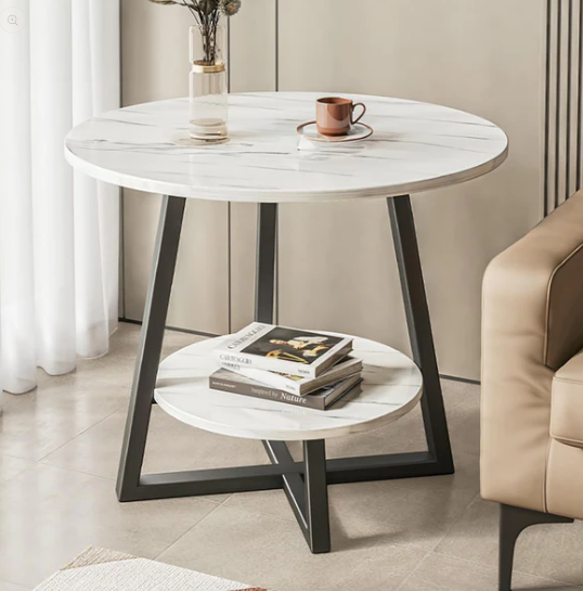 Elevate your space with this elegant 2-Tier Round Side Table featuring a sleek white marble texture finish and a sturdy metal frame. Designed for style and practicality, this modern end table offers two open storage shelves—ideal for books, décor, or your favorite cup of coffee.